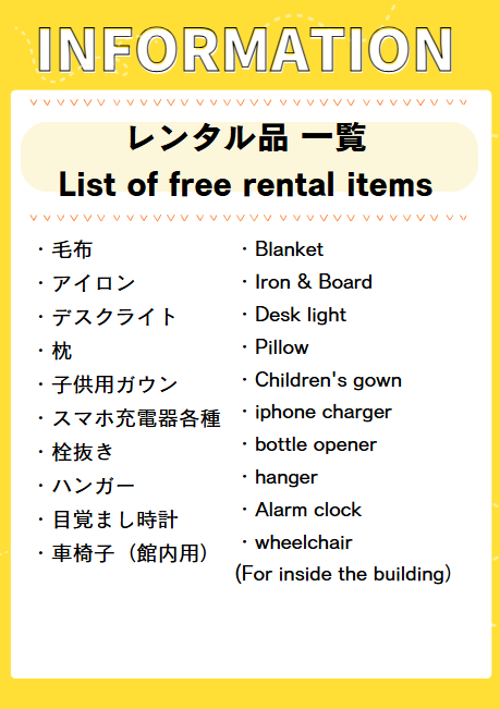 If you wish to rent various items or purchase merchandise,please feel free to ask the staff at the front desk or dial extension 9. *Please note that quantities are limited. Thank you for your understanding.