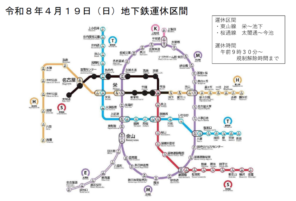 4월 19일(일)의 불발탄 처리(9:30경~)로 인해 지하철 히가시야마선의 "사카에역~이케시타역" 구간이 운휴합니다.